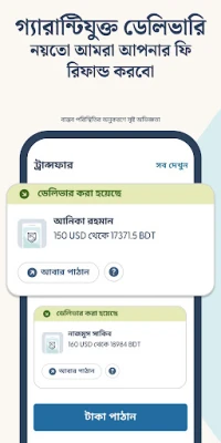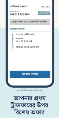 Remitly বিশ্বজুড়ে প্রিয়জনদের সাথে দ্রুত, সুরক্ষিত এবং সাশ্রয়ী উপায়ে অর্থের সেতুবন্ধন তৈরি করে। ১০০টিরও বেশি মুদ্রায় সহজে টাকা পাঠান এবং আপনার কষ্টার্জিত অর্থের সর্বাধিক মূল্য নিশ্চিত করুন। Remitly-এর মাধ্যমে প্রাপককে কোনো ফি দিতে হয় না এবং প্রেরকের জন্যও নামমাত্র চার্জ প্রযোজ্য। প্রতিটি লেনদেনে আপনি পাবেন সেরা বিনিময় হার। সবচেয়ে গুরুত্বপূর্ণ, আপনার অর্থ কখন পৌঁছাবে তা নিয়ে আর কোনো চিন্তা নয়! Remitly আপনাকে প্রতিটি ট্রান্সফারের সঠিক ডেলিভারি সময় জানায় এবং রিয়েল-টাইম আপডেটের মাধ্যমে আপনি শুরু থেকে শেষ পর্যন্ত লেনদেনের প্রতিটি ধাপ ট্র্যাক করতে পারবেন। আমরা আপনার প্রদত্ত সময়ে টাকা পৌঁছে দিতে অঙ্গীকারবদ্ধ; ব্যর্থ হলে আপনার ফি ফেরত দেওয়া হবে।