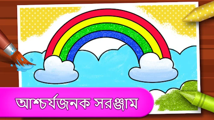 রঙিন গেমগুলির ভেতরে অপেক্ষা করছে রঙের এক বিশাল ভান্ডার, যা শিশুদের মনকে আকর্ষণ করবে। 'মজার রঙে' বিভাগে ট্যাপ করলেই সাদা পৃষ্ঠাগুলো ঝলমলে রঙে ভরে উঠবে। 'রঙ পূরণ করুন' অপশনে পাবেন স্টিকার, গ্লিটার আর বুদ্ধিদীপ্ত প্যাটার্নের সাথে নিজেদের পছন্দের ছবি সাজানোর সুযোগ। যারা নিজস্ব সৃষ্টি করতে ভালোবাসে, তাদের জন্য রয়েছে 'অঙ্কন' মোড – একটি খালি ক্যানভাস আর রঙের সম্পূর্ণ প্যালেট নিয়ে আঁকার অবাধ স্বাধীনতা। এছাড়া, 'গ্লো পেন' দিয়ে আঁকতে পারবে নিয়ন রঙে, যা অন্ধকারেও জ্বলজ্বল করবে, আর 'নম্বর পেইন্ট' দিয়ে সংখ্যা অনুযায়ী রঙ করে তৈরি করতে পারবে মনোমুগ্ধকর চিত্রকর্ম। প্রতিটি মোডই শিশুদের জন্য বিশেষভাবে ডিজাইন করা হয়েছে, যাতে তারা সহজে ব্যবহার করতে পারে এবং নিজেদের দক্ষতা বাড়াতে পারে।